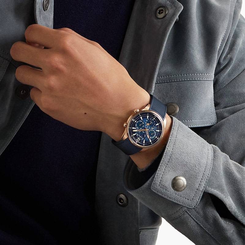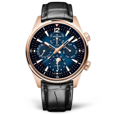 Reloj Jaeger-LeCoultre Polaris Perpetual Calendar Q908269J. El calendario perpetuo se considera una de las complicaciones relojeras más difíciles de dominar. El nuevo reloj Polaris Perpetual Calendar, deportivo y elegante, invita al aventurero de hoy en día a disfrutar de una precisión casi perpetua. Este nuevo reloj de Jaeger-LeCoultre, equipado con el calibre 868 y diseñado, fabricado y montado en la Manufactura, exhibe sus 351 componentes bajo su fondo de zafiro. Entre los avances integrados en este movimiento, se incluyen las fases lunares de ambos hemisferios, con una manecilla retrógrada para el hemisferio sur. La esfera lacada, realzada mediante el bisel y las asas de la caja en oro rosa, luce un degradado impresionante en tonos azules. Las manecillas y los marcadores de la hora luminiscentes destacan sobre el color azul océano, junto con las indicaciones del calendario perpetuo y las fases lunares. El reloj Polaris Perpetual Calendar está disponible también con un dúo de correas intercambiables: una de caucho azul y otra de piel de caimán de color negro con una hebilla desplegable.