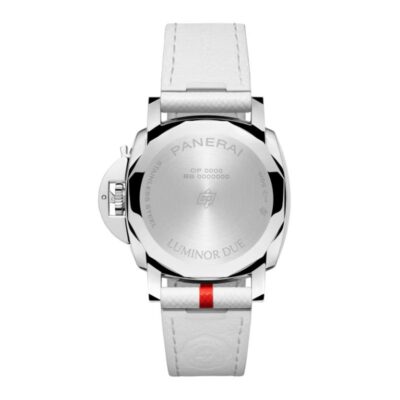 El reloj Panerai Luminor Due Luna Rossa PAM01378 cuenta con un diseño elegante, que exhibe una esfera blanca. Presenta una correa Luna Rossa de piel de becerro saffiano blanca que garantiza confort y durabilidad. Tiene una caja de acero pulido con un diámetro de 38mm. Incorpora un movimiento mecánico automático con calibre P.900, que proporciona una reserva de marcha de 3 días aproximadamente. Los relojes Luminor Due destacan como la colección más versátil de Panerai, presentando una caja más fina, más ligera y más elegante.