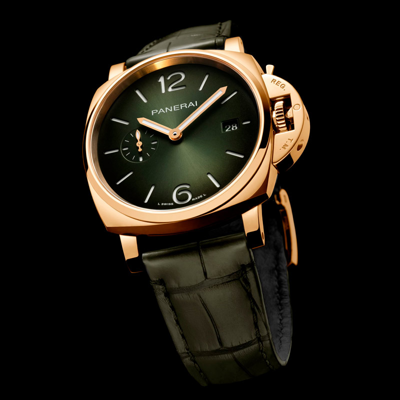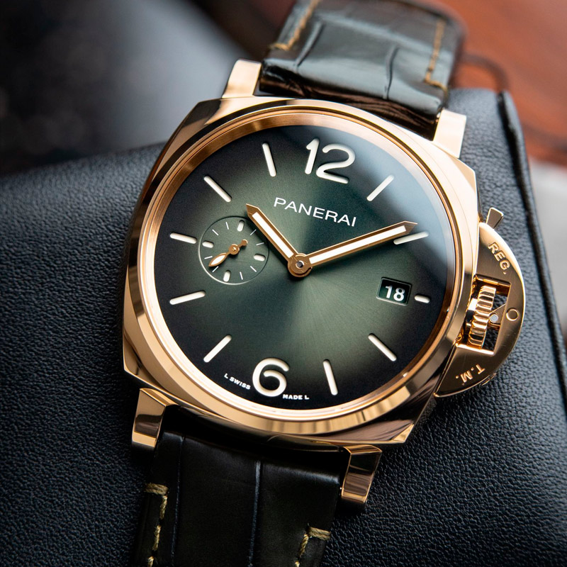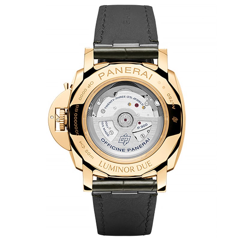 Reloj Panerai Luminor Due Yellow Gold PAM01423. Movimiento mecánico automático, calibre P.900, 12½ líneas, 4,2 mm de espesor, 23 rubíes, 28 800 alternancias/hora. Dispositivo antichoque Incabloc®. Reserva de marcha de 3 días, un barrilete. 171 componentes.