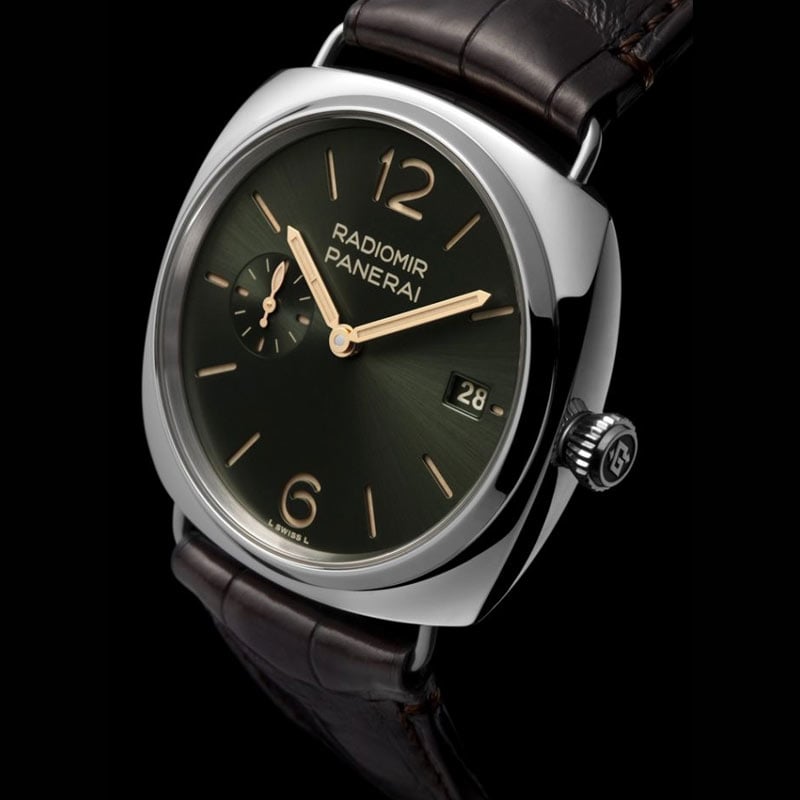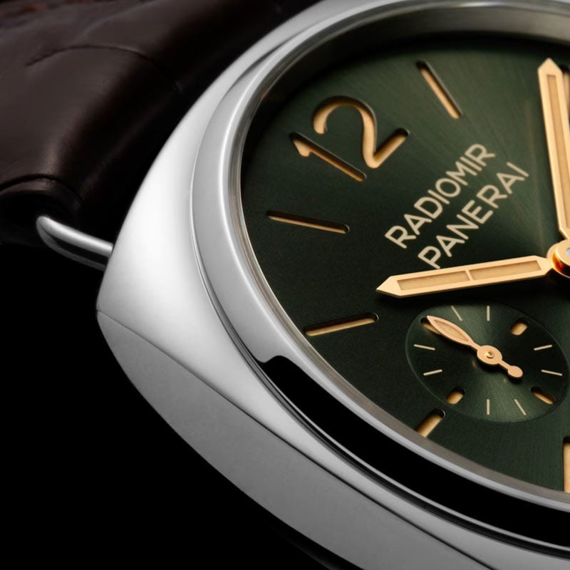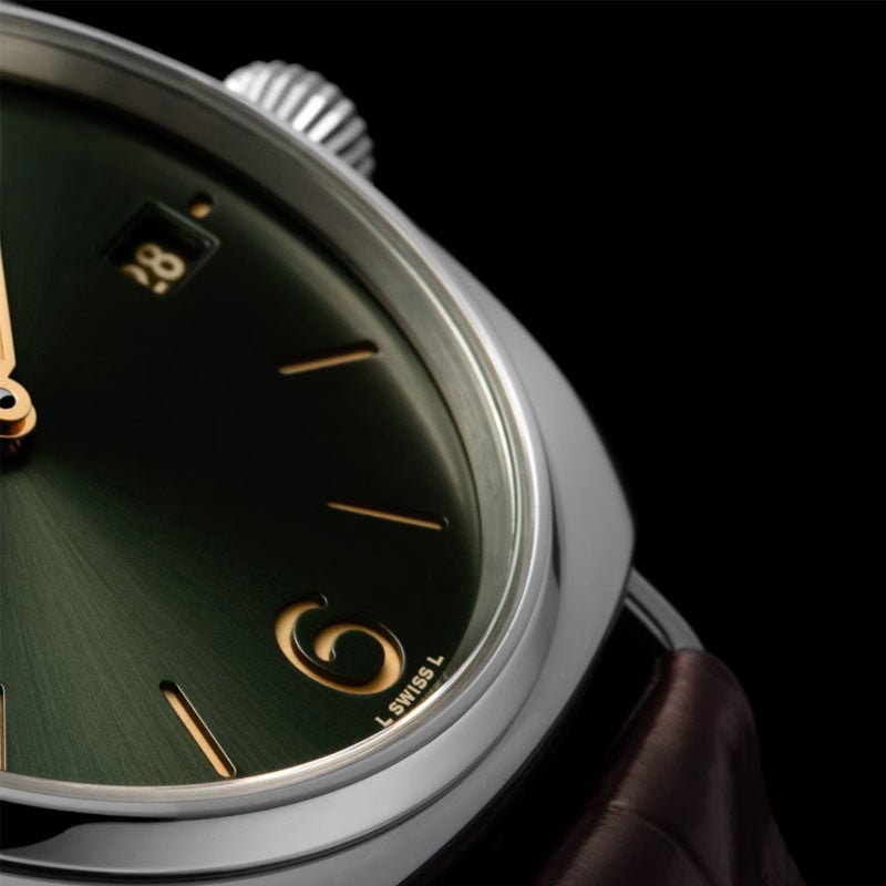 Reloj Panerai Radiomir Quaranta PAM01386 de movimiento automático. El elegante Radiomir Quaranta 40 mm tiene una esfera verde con números arábigos e índices de hora luminosos. Se incluye fecha a las 3h y segundero pequeño a las 9h con correa de piel de aligátor azul.